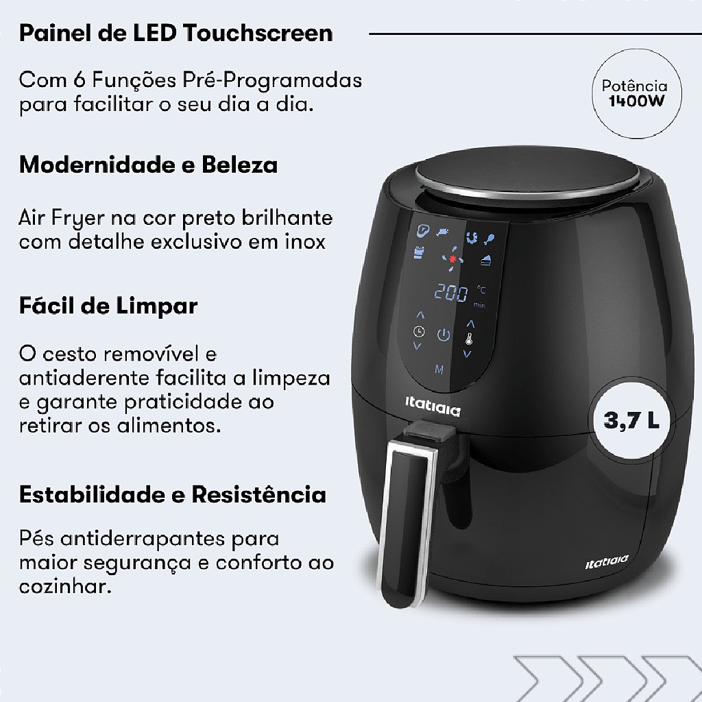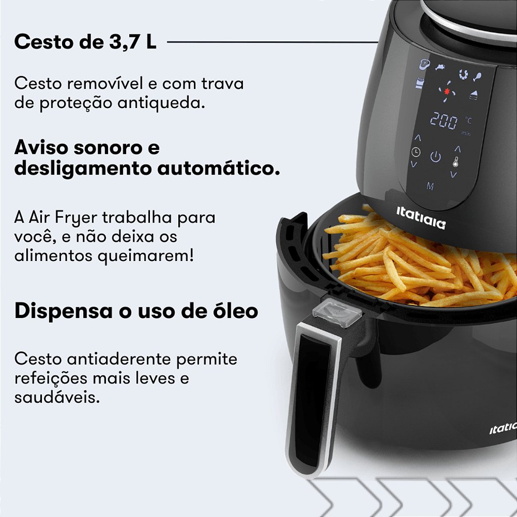 A Air Fryer da Itatiaia possui um acabamento em black piano, elegante e sofisticado, que combina perfeitamente com qualquer cozinha moderna. Com a fritadeira elétrica da Itatiaia, você terá uma verdadeira experiência gastronômica, podendo preparar tudo de forma rápida e prática.