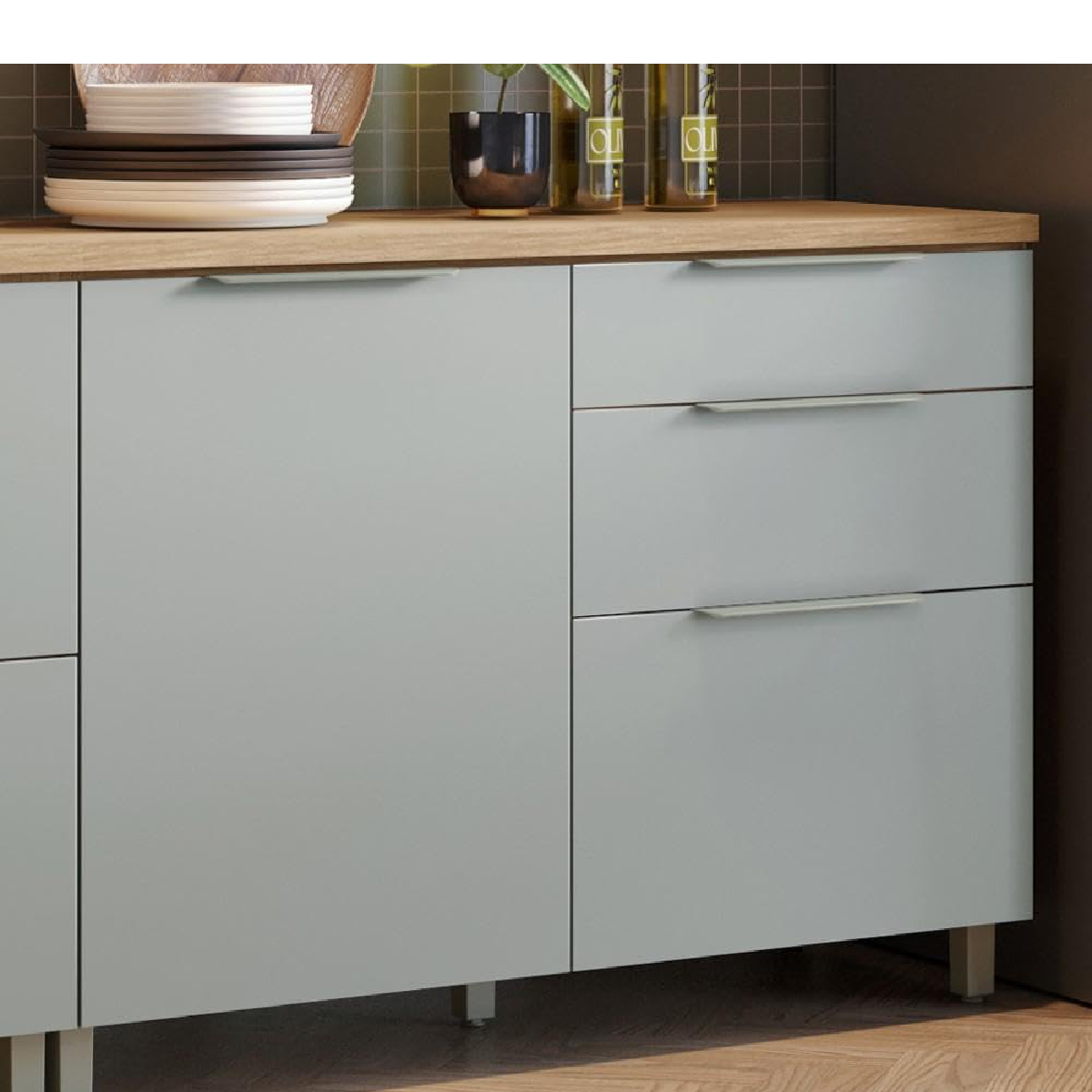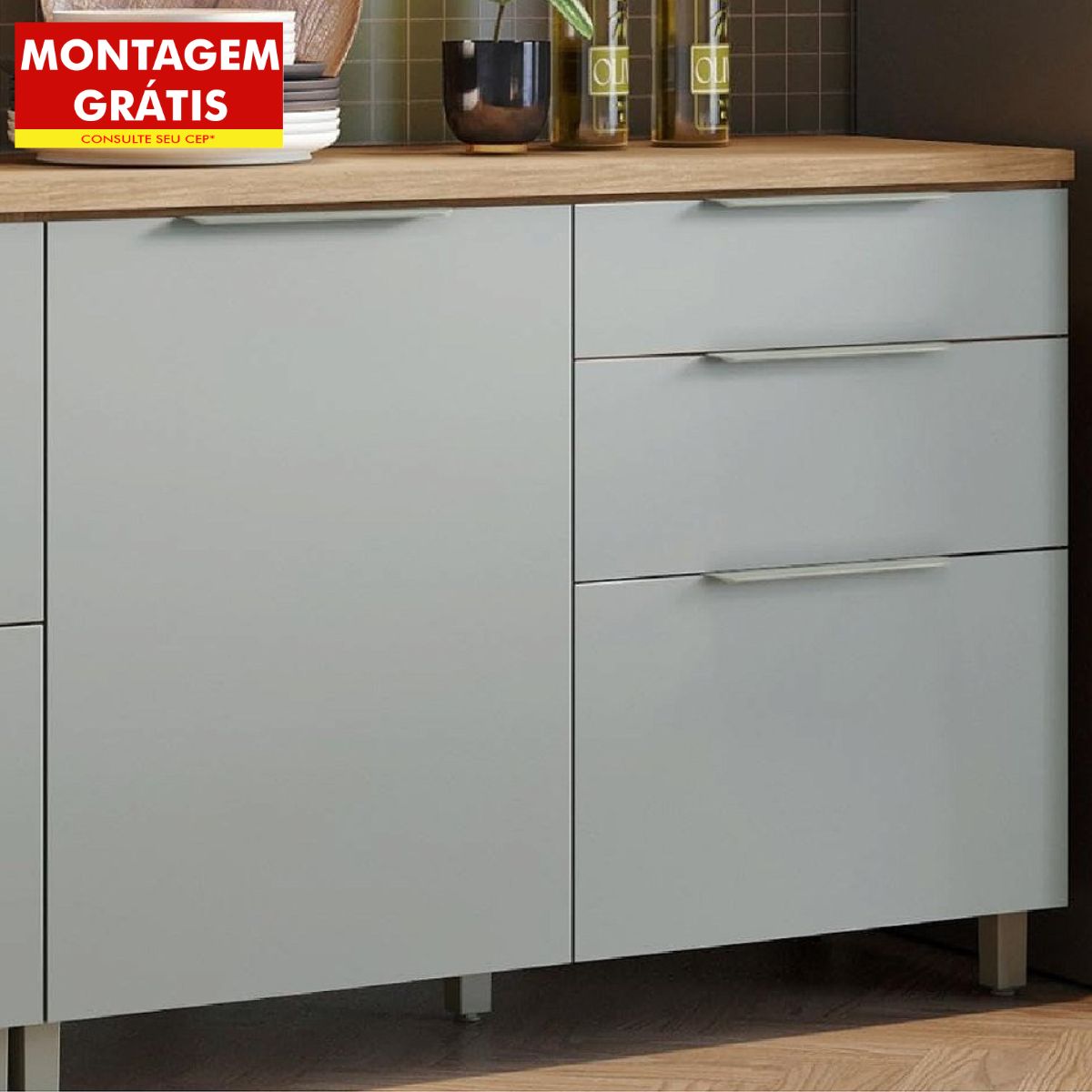 Com uma largura generosa de 120cm, este balcão foi pensado para otimizar cada centímetro do seu espaço. Ele oferece uma porta espaçosa e três gavetas profundas, garantindo que tudo, desde suas panelas favoritas até os talheres e utensílios menores, encontre seu lugar. As gavetas deslizam suavemente sobre corrediças telescópicas, revelando o conteúdo sem esforço e com total silêncio. A porta, equipada com dobradiças que possuem o sistema slow motion (freio anti-impacto), fecha delicadamente, preservando o móvel e garantindo durabilidade. Os puxadores modernos complementam o design, unindo beleza e funcionalidade.