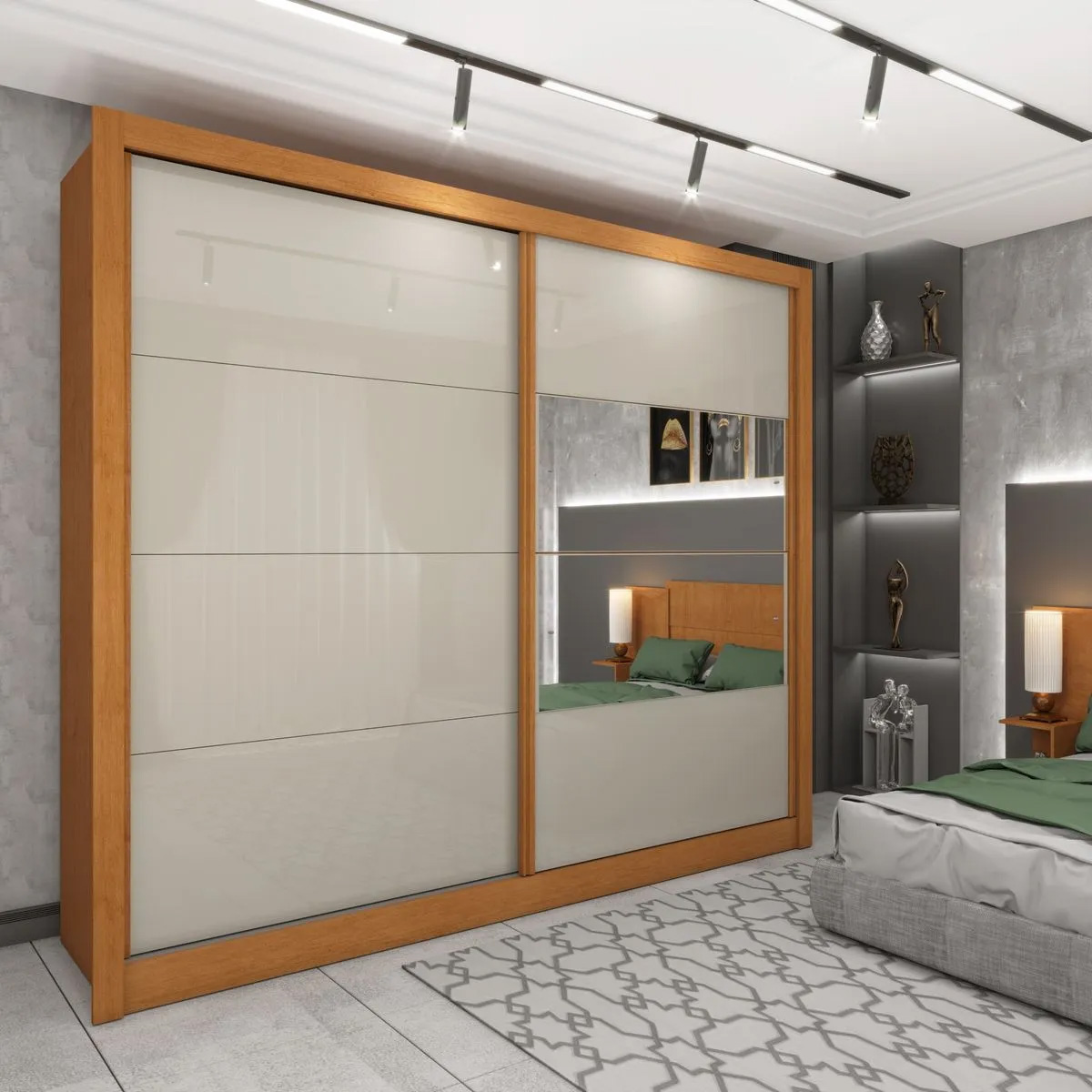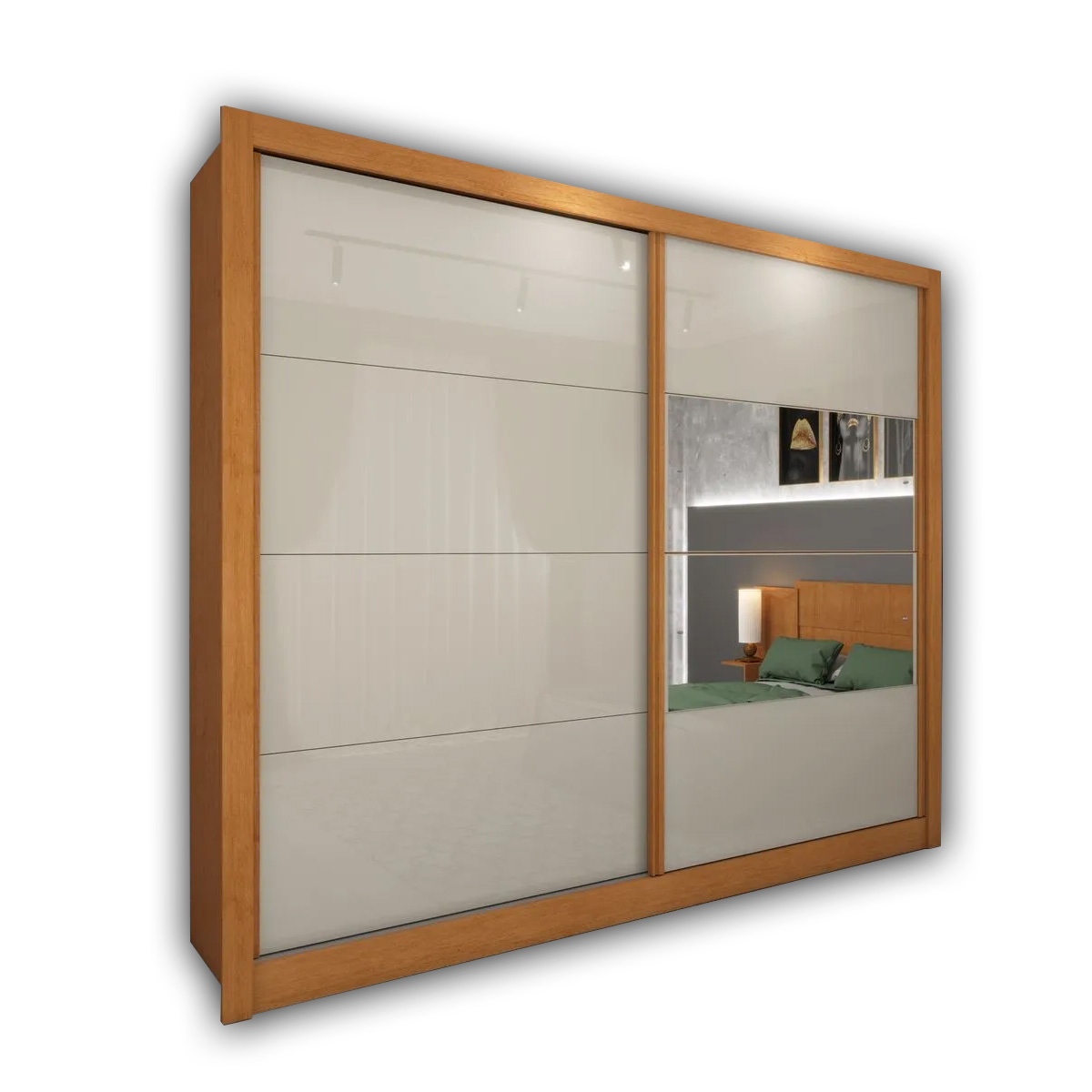 Duas Portas de Correr (Elegância que Economiza Espaço!): Chega de portas que atrapalham a circulação! As duas portas de correr deslizam suavemente, otimizando o espaço do seu quarto e facilitando o acesso a todas as suas preciosidades com um toque de modernidade.