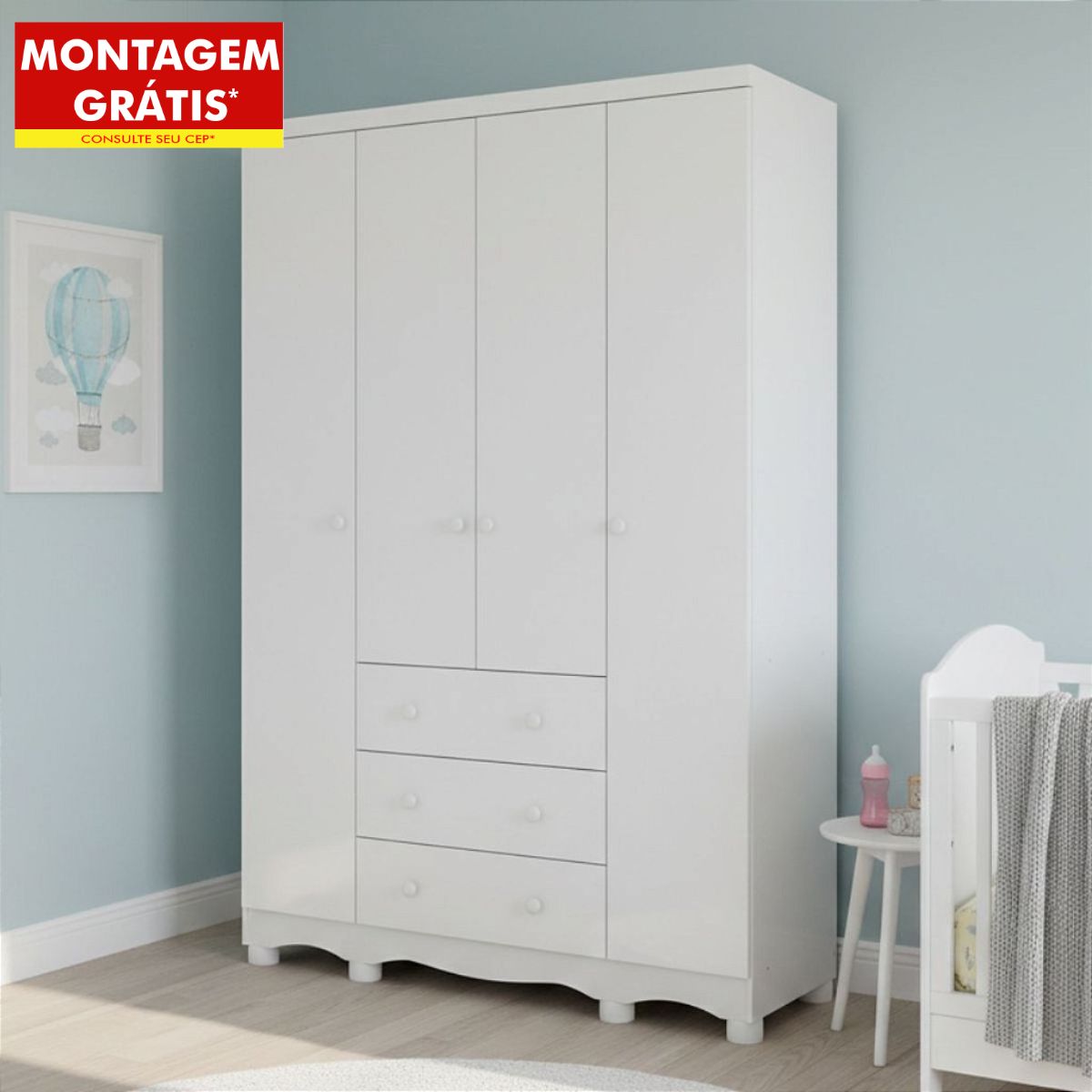 Design Espaçoso e Funcional (Um Universo de Organização!): Com suas dimensões generosas (1,89m Altura x 1,22m Largura x 0,42m Profundidade), ele oferece um amplo espaço interno. São 4 portas de bater e 3 gavetas espaçosas para organizar roupinhas, fraldas, cobertores, acessórios, brinquedos e tudo mais que o mundo do seu bebê precisar!
