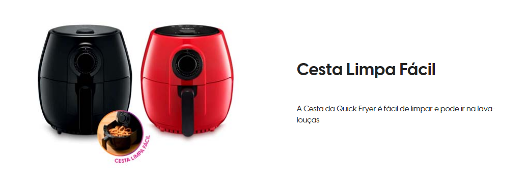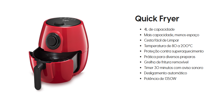 A alta temperatura proporcionada pela Fritadeira Elétrica Quick Fryer faz com que os alimentos fiquem muito parecidos com os que são fritos em óleo quente, mas sem serem realmente fritos. Por isso, este tipo de aparelho é considerado um aliado da alimentação saudável.