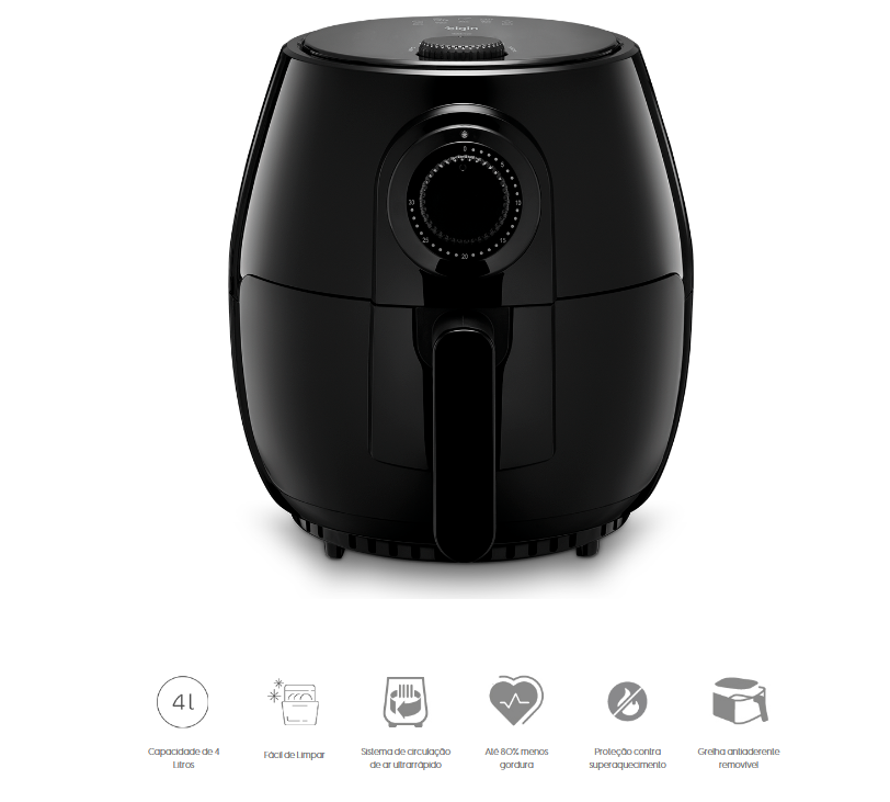A Fritadeira Elétrica Quick Fryer é um produto desenvolvido pela Elgin para atender às pessoas que estão em busca de uma dieta mais saudável, sem a presença de itens preparados no óleo. Com este dispositivo, é possível preparar legumes, carnes, batatas-fritas, salgadinhos e hambúrgueres — tudo utilizando apenas ar quente e a gordura presente nos alimentos, sem acrescentar óleo às receitas.