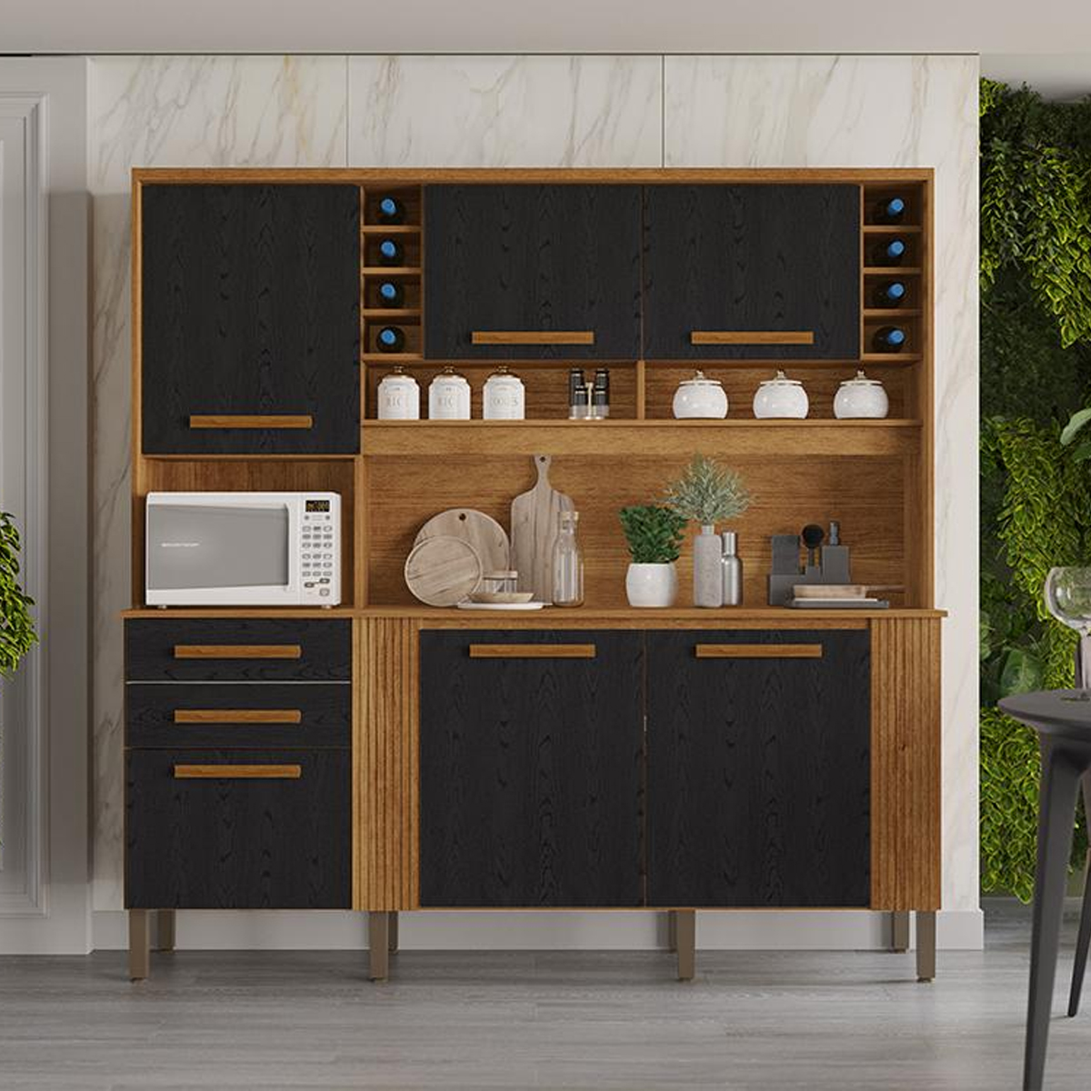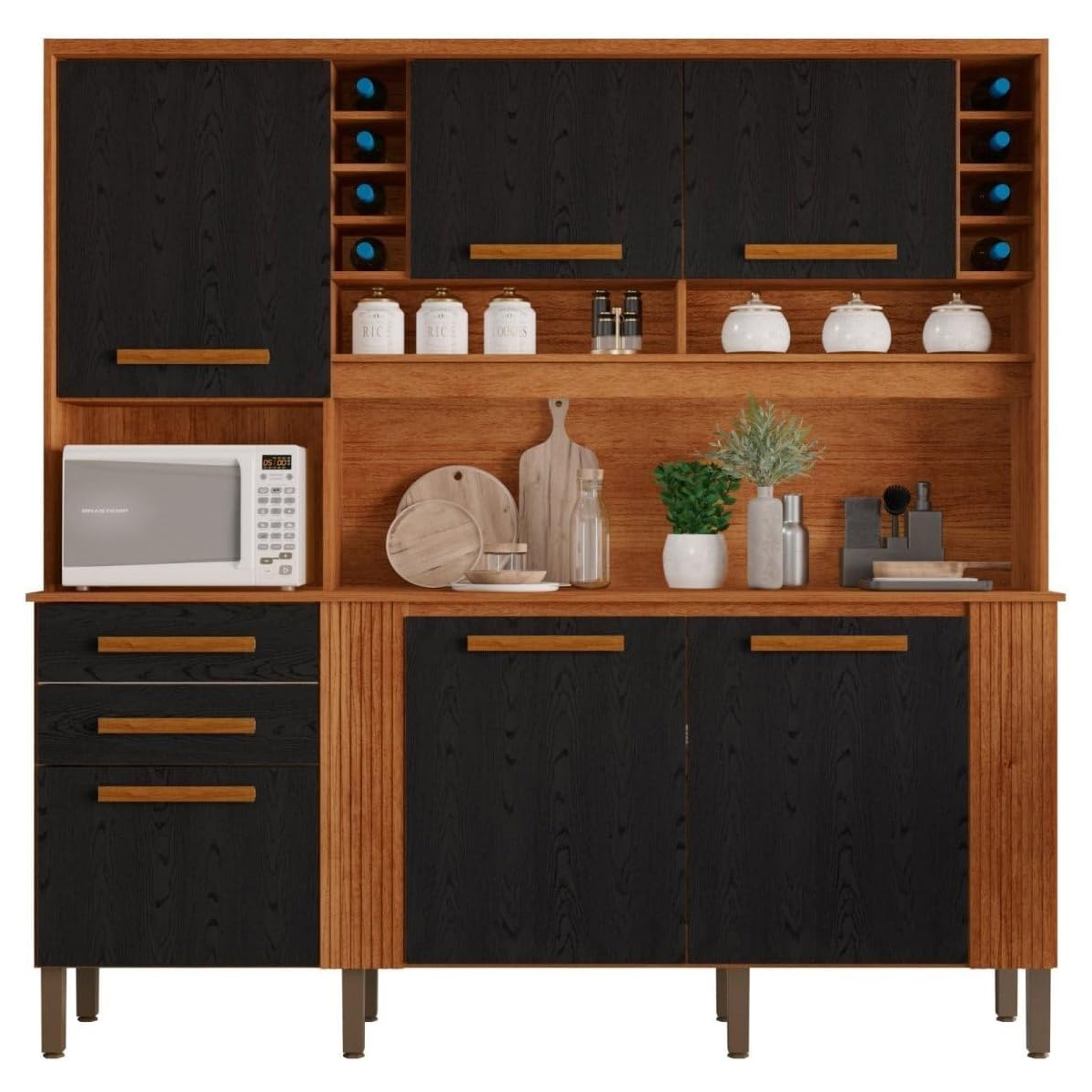 Com suas dimensões inteligentes – 2,00m de altura, 2,00m de largura e 0,45m de profundidade – e o charmoso acabamento em Cinamomo com Preto, o Kit Cozinha Salleto Catar é a peça que faltava para dar um toque de modernidade, sofisticação e funcionalidade à sua casa. É a prova de que espaço compacto não significa falta de estilo ou personalidade!