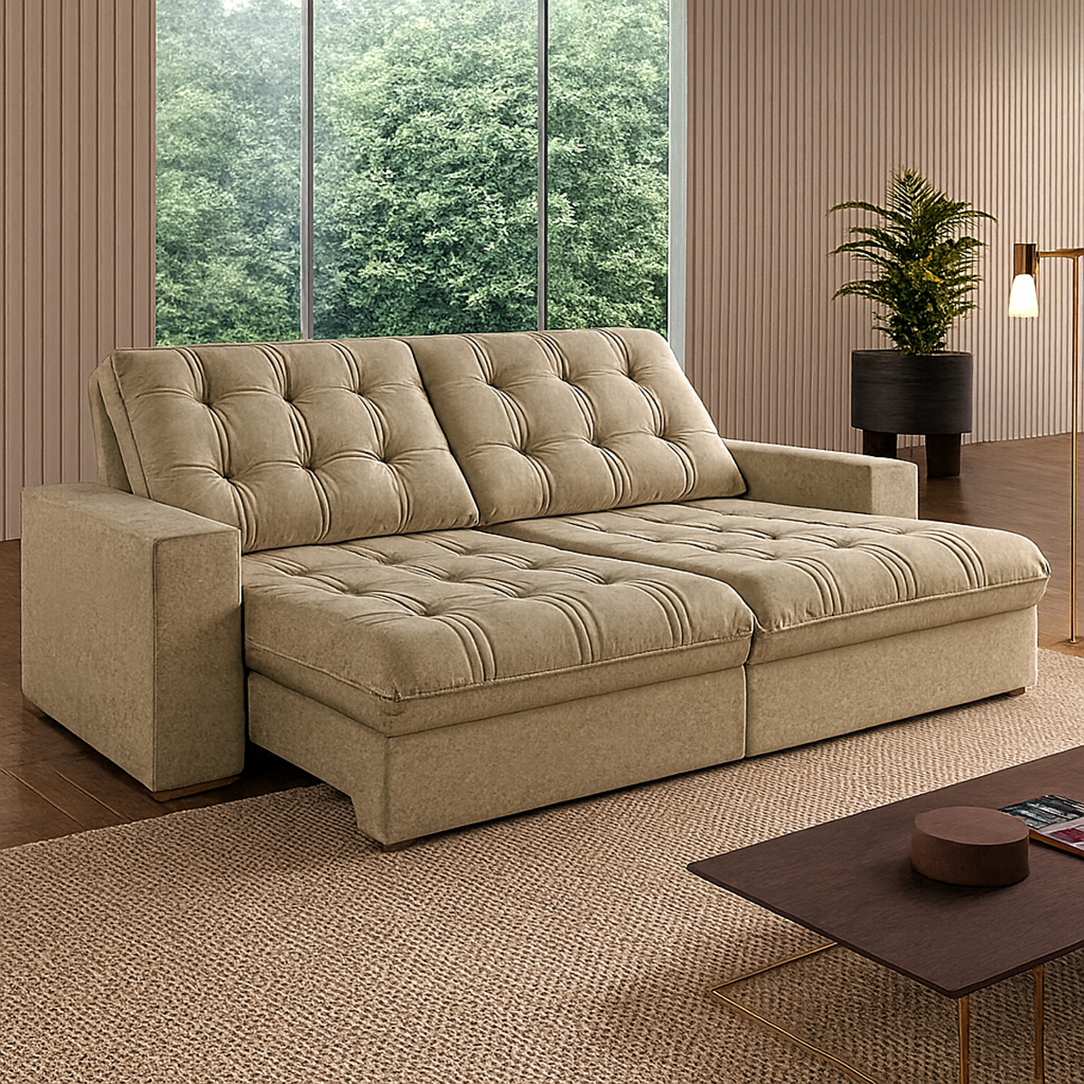 Retrátil (O Convite Aberto para Esticar as Pernas!): Prepare-se para o convite mais tentador do dia! Com o sistema retrátil, você pode esticar as pernas, reclinar-se e transformar seu sofá em uma chaise gigante, perfeita para maratonar séries, ler um bom livro ou tirar aquele cochilo revigorante.