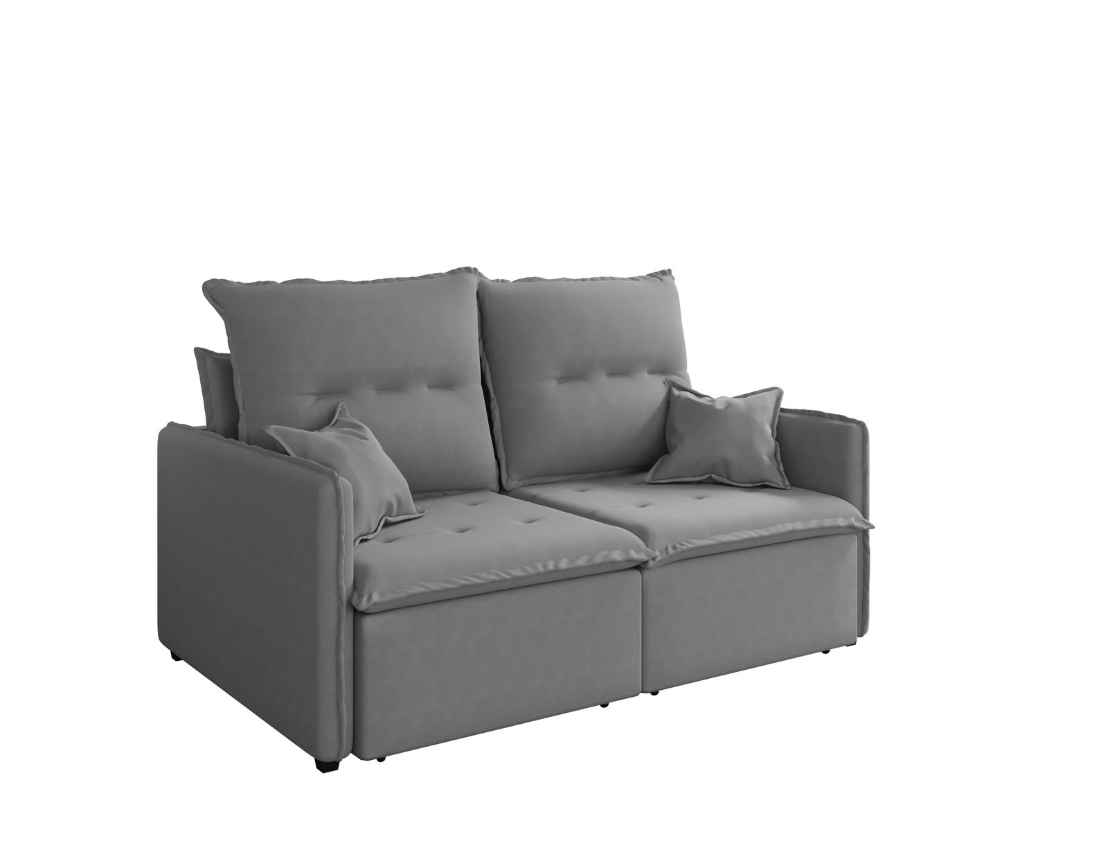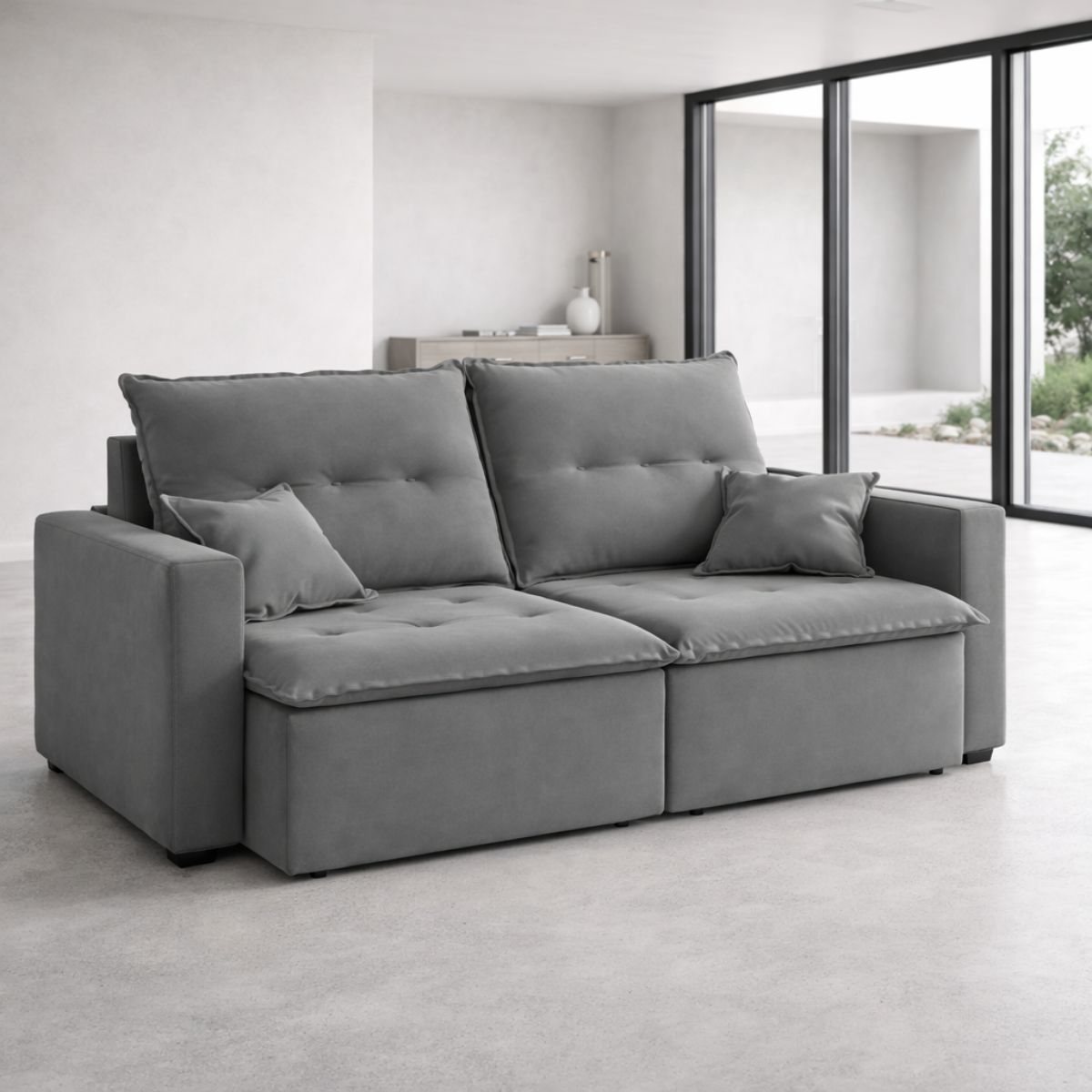 Imagine ter um sofá de 2 metros de largura que te abraça com seu tecido Sued Aveludado na sofisticada cor cinza. Perfeito para relaxar, assistir séries, receber amigos ou simplesmente desfrutar de um momento de paz. Sua profundidade de 1,00m (fechado) e altura de 1,00m garantem um conforto generoso e uma presença imponente no ambiente.