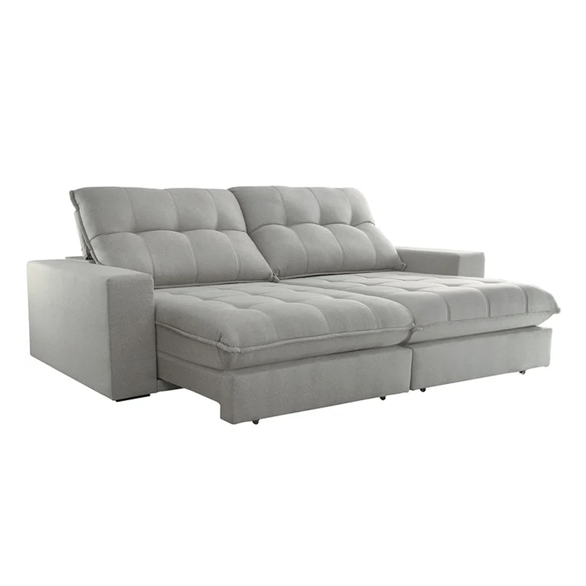 Assentos Retráteis (Seu Lazer no Modo Extensão Total!): Com assentos que se estendem, você transforma seu sofá comum em um chaise-longue gigante em segundos! É perfeito para esticar as pernas, tirar um cochilo rápido ou se aconchegar para ler. A profundidade de 120cm (fechado) se transforma em um abraço generoso quando aberto.
