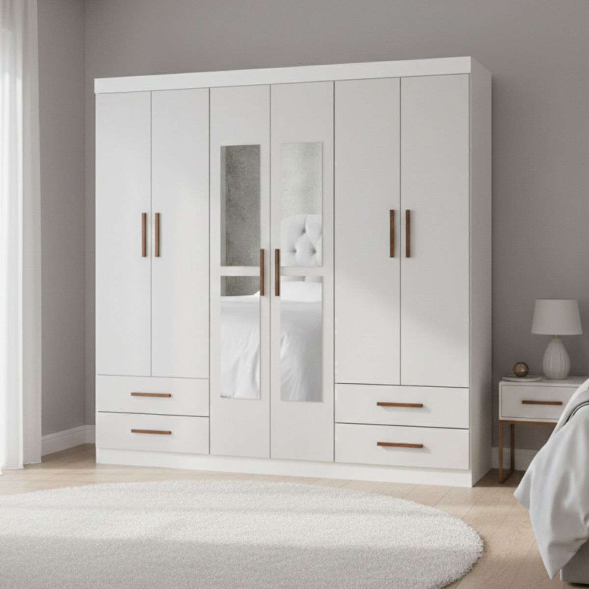 Espelho Integrado (Seu Consultor de Estilo Particular!): Ah, o espelho! Estrategicamente posicionado, ele é perfeito para conferir o visual antes de sair para conquistar o dia. Além de ser super prático, ele tem o superpoder de ampliar visualmente o seu quarto, adicionando luminosidade e uma sensação de grandiosidade. É beleza, funcionalidade e um reflexo do seu bom gosto juntas!